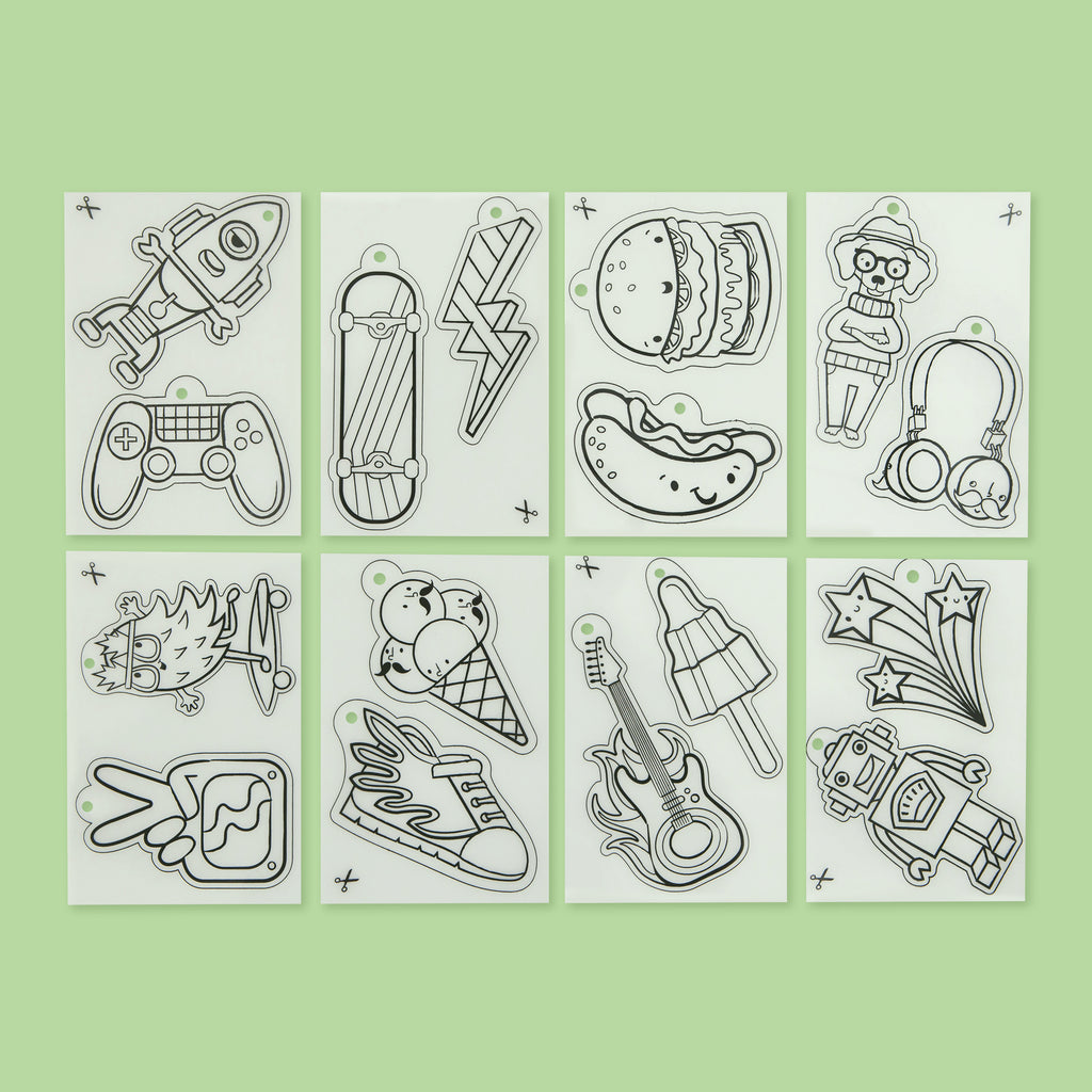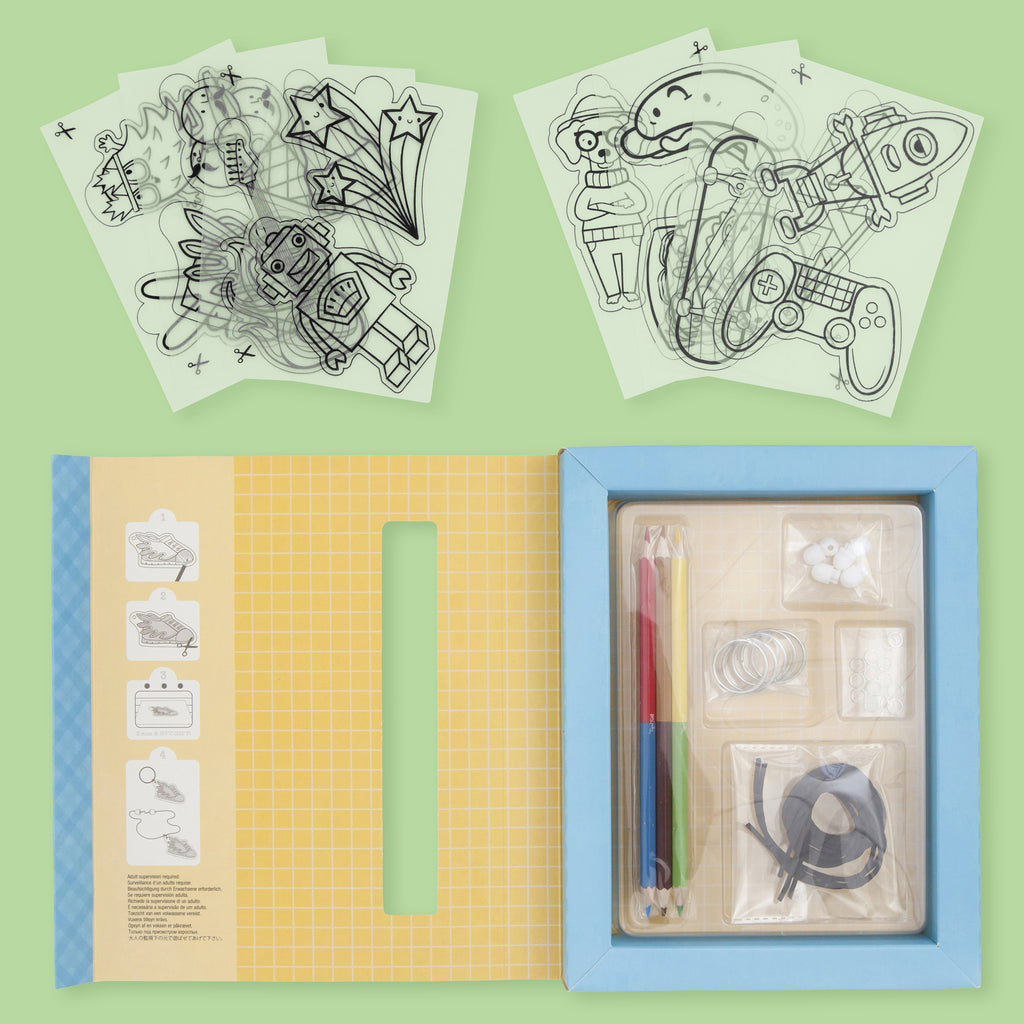 Simply colour the beautifully illustrated pre-cut designs, pop them in the oven and watch them magically shrink to 40% of their original size!