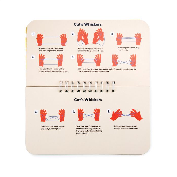 Wire-bound cat faced books with string to create various cats cradles, such as Cup and Saucer, Jet Plane, Star, Cats Whiskers, and Witches Broom.