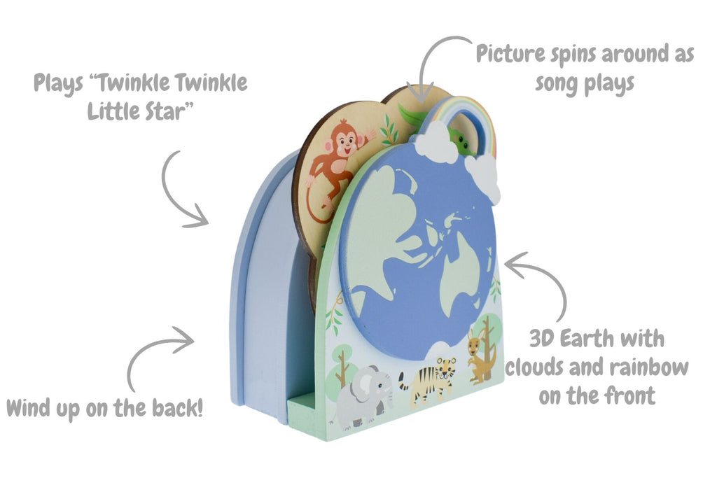 As children wind up this enchanting music box, they'll be captivated by the gentle spinning of colourful animal friends twirling in time to the classic lullaby Twinkle, Twinkle, Little Star. The soft melody fills the room, creating a soothing atmosphere perfect for playtime or bedtime routines. When the music fades, the ferris wheel slows to a stop, patiently waiting to be wound up again and set into motion for endless rounds of joyful fun.