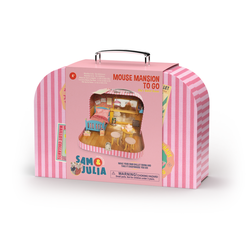 Step into Ella's Ballet Room. This fully furnished room in a suitcase is teeming with charm and includes a bed, a full-length ballet mirror with barre, a table for two, a tea set and other accessories. Assemble your own Ballet Room using the wooden construction pieces and decoration sheets.