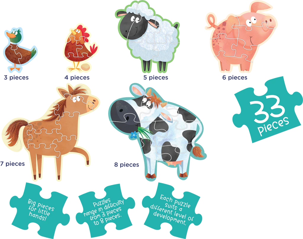 Introduce little ones to the joy of puzzles with this carry-along boxset featuring 6 animal-shaped puzzles. These mini puzzles, ranging from 3 to 8 pieces, are perfect for curious minds.