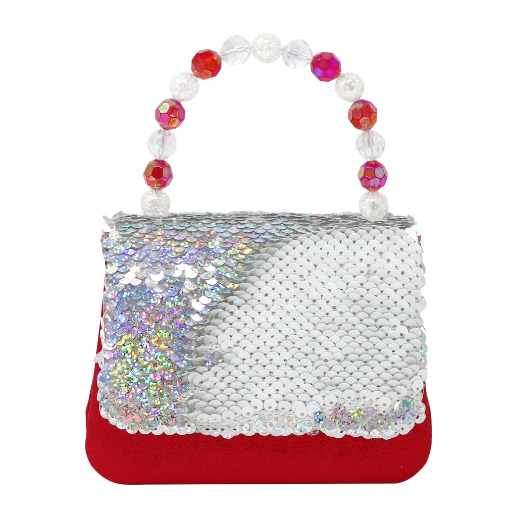 Complete their festive look with the iconic Pink Poppy's Christmas Reversible Sequin Festive Handbag with an iridescent beaded handle. The reversible sequin flap swishes from iridescent silver to white. Features a magnetic stud for easy closure and an additional cord shoulder strap for hands-free play.