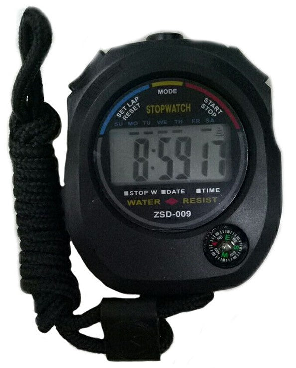 Hand held stopwatch with thumb and forefinger control. Accurate to 1/100 of a second. Features split/lap time, 12 and 24 hour time, alarm, date functions and a handy wrist/neck strap. Stop watch is water resistant.