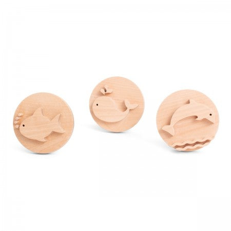 Press firmly to reveal dolphins, fish or whales. Each stamp features a chunky handle that makes it easier for small hands to grip.